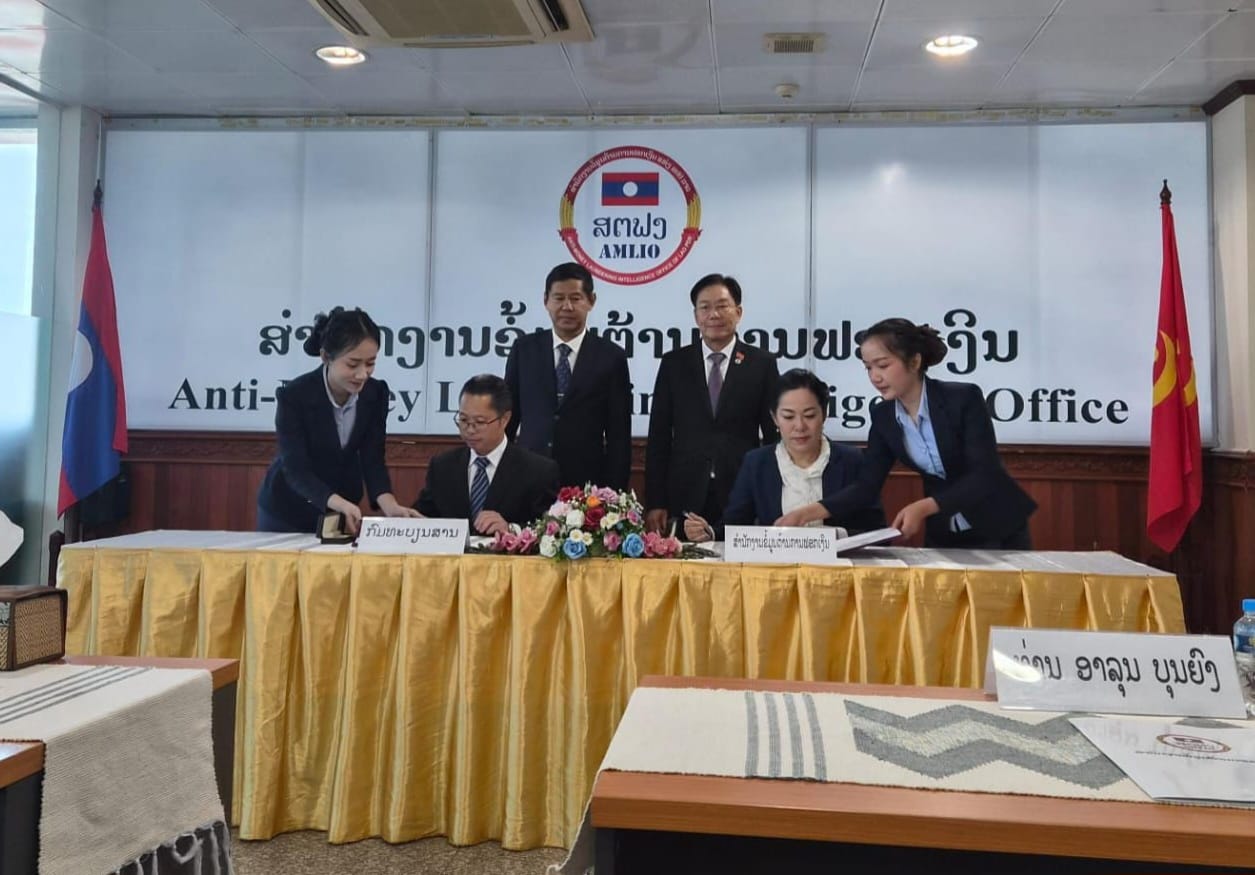 ພິທີເຊັນບົດບັນທຶກຄວາມເຂົ້າໃຈ (MOU) ລະຫວ່າງ ສໍານັກງານຂໍ້ມູນຕ້ານການຟອກເງິນ (ສຕຟງ), ທະນາຄານແຫ່ງ ສປປ ລາວ ແລະ ກົມທະບຽນສານ, ກະຊວງຍຸຕິທໍາ ທີ່ຫ້ອງປະຊຸມຊັ້ນ VII ສຕຟງ, ໃນວັນທີ 20 ພະຈິກ 2025. ໂດຍເປັນກຽດໃນການເຂົ້າຮ່ວມຂອງ ທ່ານ ອາລຸນ ບຸນຍົງ ຮອງຜູ້ວ່າການ ທະນາຄານແຫ່ງ ສປປ ລາວ, ທ່ານ ຄໍາພັນ ບຸນພາຄົມ ຮອງລັດຖະມົນຕີ, ກະຊວງຍຸຕິທໍາ ພ້ອມດ້ວຍບັນດາທ່ານຄະນະກົມ, ຄະນະພະແນກ ແລະ ເເຂກທີ່ເຂົ້າຮ່ວມຈາກກົມກ່ຽວຂ້ອງ ພາຍໃນ ທຫລ ແລະ ກະຊວງຍຸຕິທໍາ.