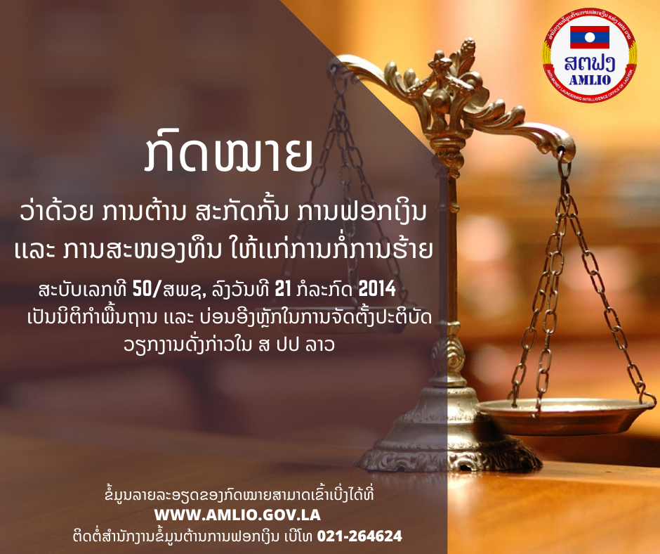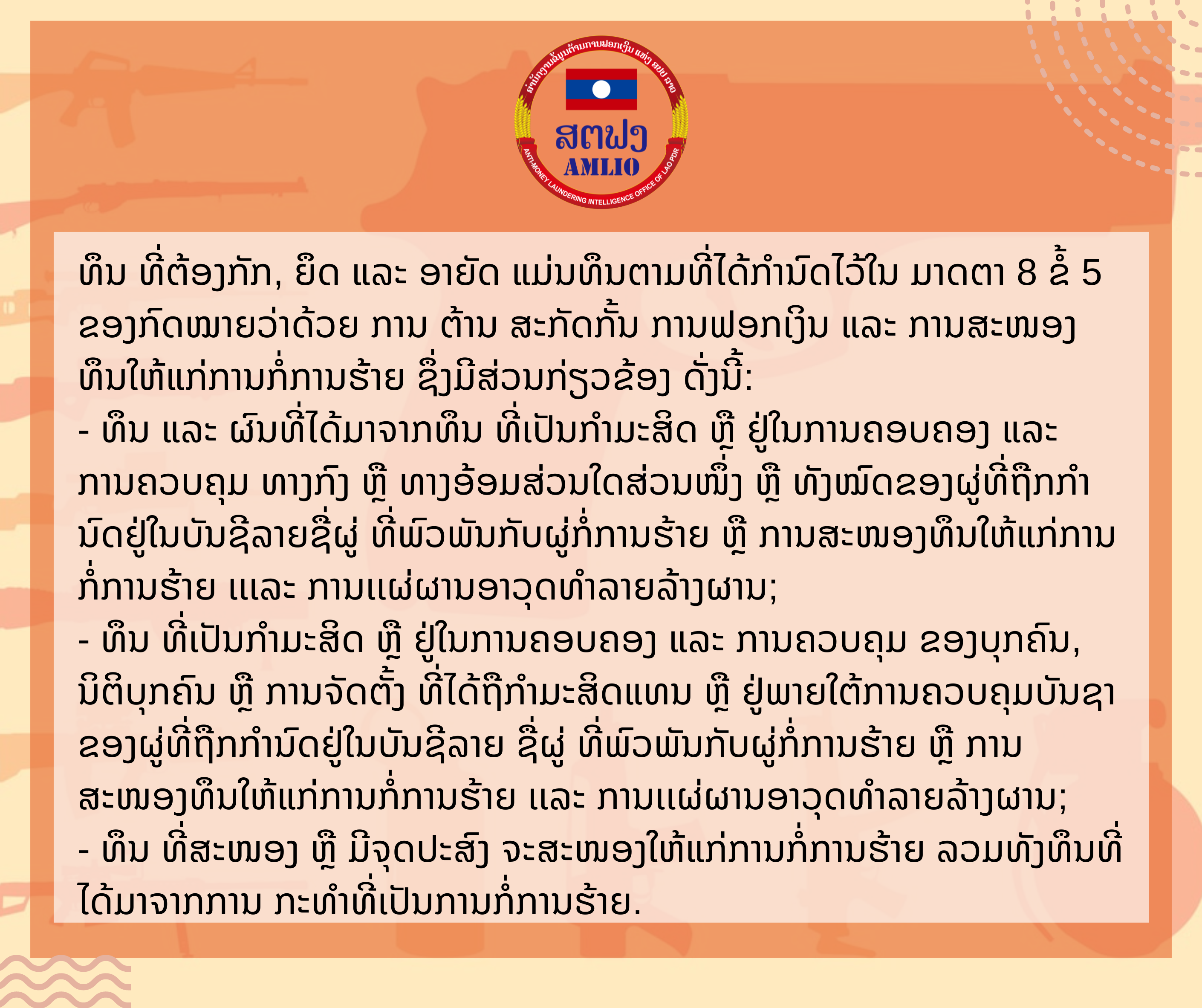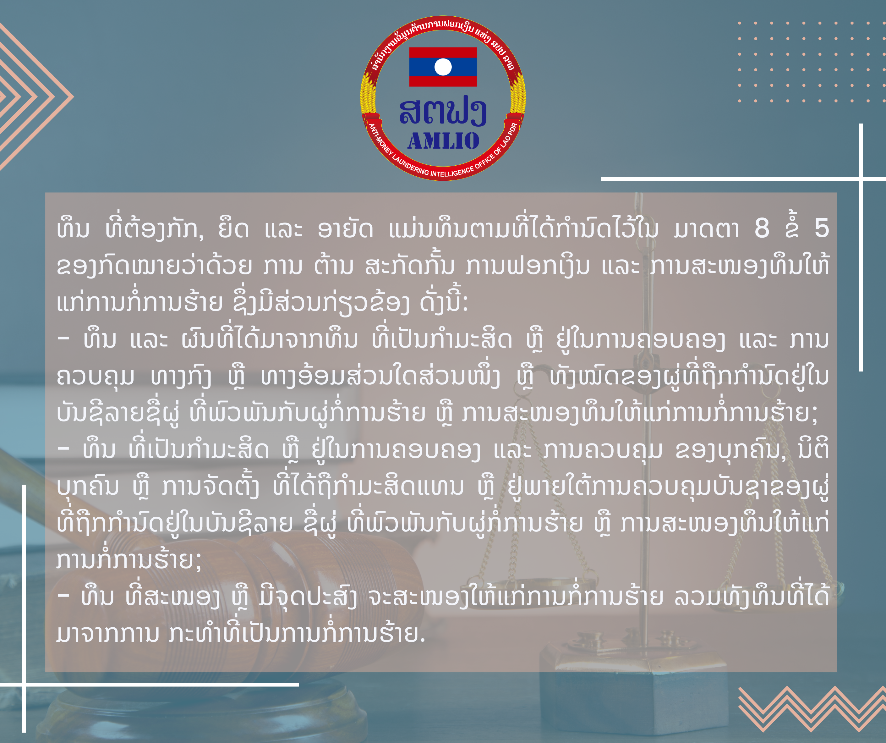 ຕາມທີ່ໄດ້ກຳນົດໄວ້ໃນມາດຕາ 3 ຂອງກົດໝາຍວ່າດ້ວຍ ການຕ້ານ ສະກັດກັ້ນ ການຟອກເງິນ ແລະ ການສະໜອງທຶນໃຫ້ແກ່ການກໍ່ການຮ້າຍ ຊຶ່ງເປັນການກະທຳຜິດ ທີ່ເປັນອັນຕະລາຍຕໍ່ລະບົບເສດຖະກິດ ແລະ ແຕະຕ້ອງເຖິງລະບອບ ການເມືອງຂອງຊາດ.