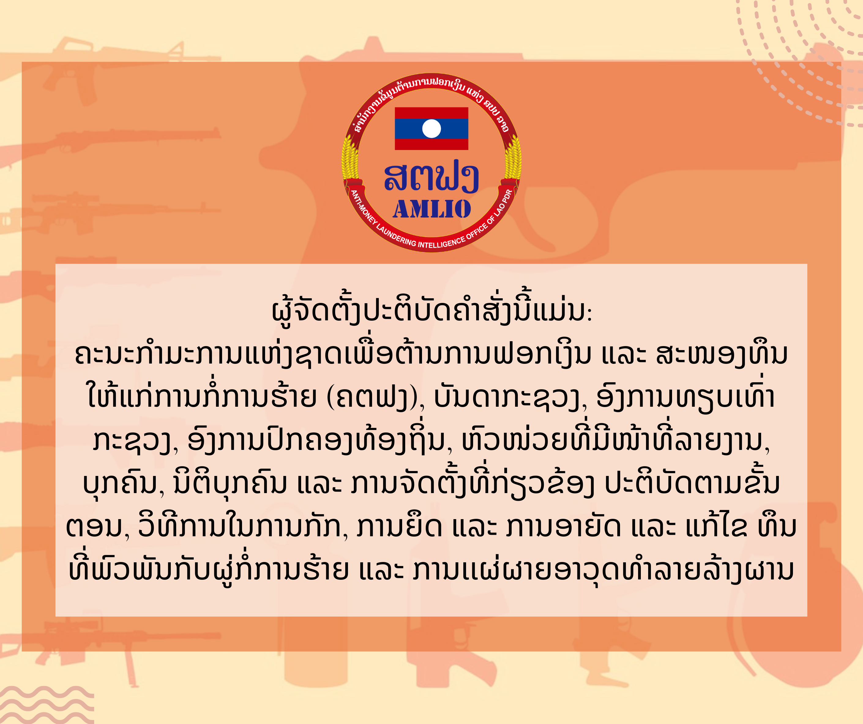 ການຕ້ານ ສະກັດກັ້ນ ການສະໜອງທຶນໃຫ້ແກ່ການກໍ່ການຮ້າຍ ແມ່ນ ການເຄື່ອນໄຫວ ຂອງບຸກ ຄົນ, ນິຕິບຸກຄົນ ແລະ ການຈັດຕັ້ງ ທີ່ມີໜ້າທີ່ໂດຍກົງໃນການຊອກຮູ້, ຕ້ານ, ສະກັດກັ້ນ, ຈຳກັດ ແລະ ກຳຈັດ ການສະໜອງທຶນໃຫ້ແກ່ການກໍ່ການຮ້າຍ